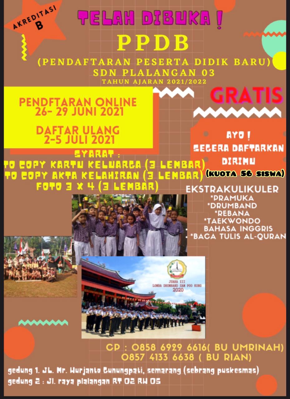 Tahun Pelajaran 2021/2022 SDN Plalangan 03 membuka 2 rombel, dengan jumlah kuota 56 siswa.